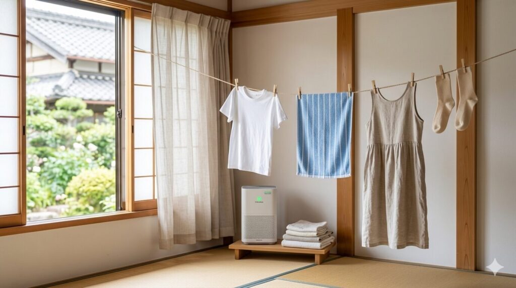 室内干しは花粉対策として最も効果的で、扇風機や除湿機、アーチ干しを組み合わせれば乾きにくさも解消できます。